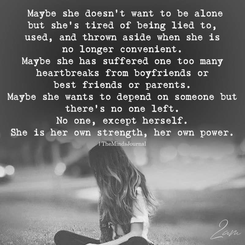 Maybe she doesn’t want to be alone but she’s tired of being lied to, used, and thrown aside when she is no longer convenient. Maybe she has suffered one too many heartbreaks from boyfriends or best friends or parents. Maybe she wants to depend on someone but there’s no one left. No one, except herself. She is her own strength, her own power.