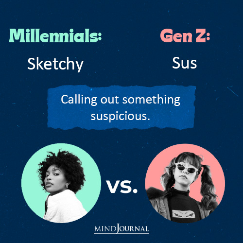 When it comes to gen z vs millennial slang, if someone is acting strange, Gen Z calls it “sus”, short for suspicious. Instead of saying “That seems sketchy,” just drop: “That’s kinda sus.” Quick, casual, and perfect for memes or DMs.