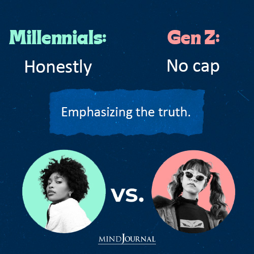 We millennials say “Honestly” or “Truthfully” to emphasize honesty. But gen Z prefers “no cap”. It is direct, simple, and straightforward.