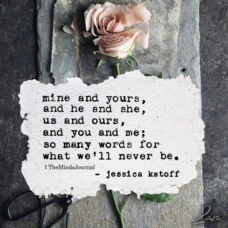 Mine and yours, and he and she, us and ours, and you and me; so many words for what we’ll never be.
