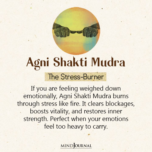 When negative emotions pile up, Agni Shakti Mudra acts like fire, it helps โburn awayโ anxiety and clears emotional heaviness. Itโs a fantastic choice among mudras for stress and anxiety when you are feeling overwhelmed and weighed down.