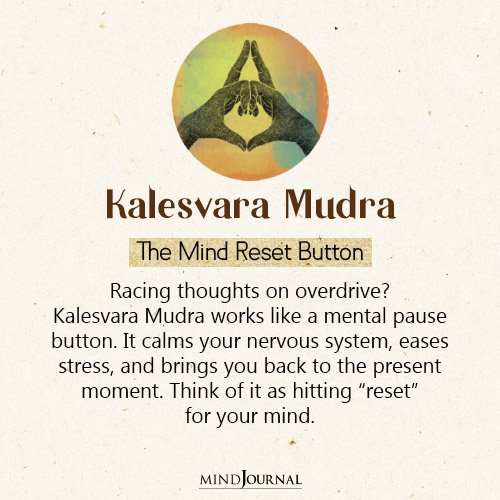 Kalesvara Mudra is often called the “reset mudra” because it works like a pause button for your racing thoughts. It’s one of the best mudras for dealing with anxiety, because it helps in bringing your awareness back to the present moment.