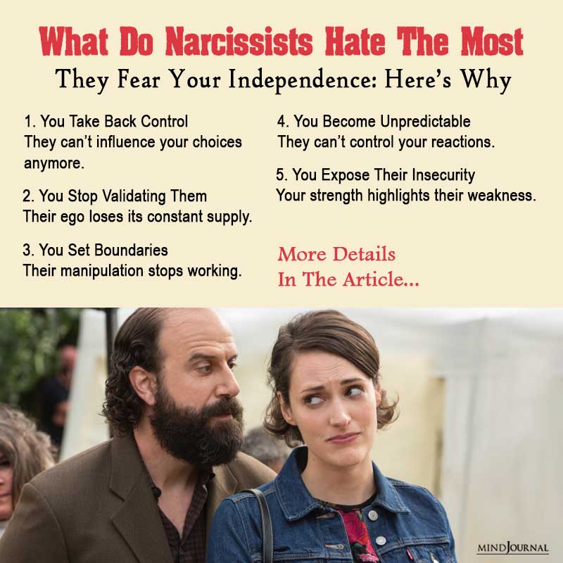 A narcissist’s sense of self often comes from external validation. These people need constant attention, reassurance, and emotional support to feel stable. When you are independent, you naturally stop over-giving and create a boundary. You don’t constantly validate them or revolve around their needs. This is one of the core reasons why narcissists hate independence, because it cuts off a major source of their emotional supply.