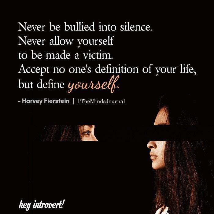 Never be bullied into silence. Never allow yourself to be made a victim. Accept no one’s definition of your life, but define yourself.