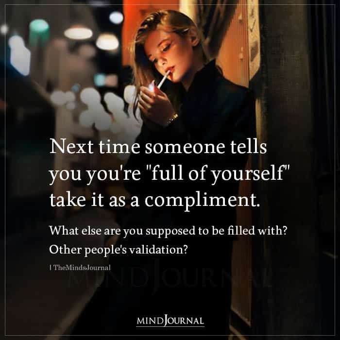 Next time someone tells you you’re “full of yourself” take it as a compliment. What else are you supposed to be filled with? Other people’s validation?