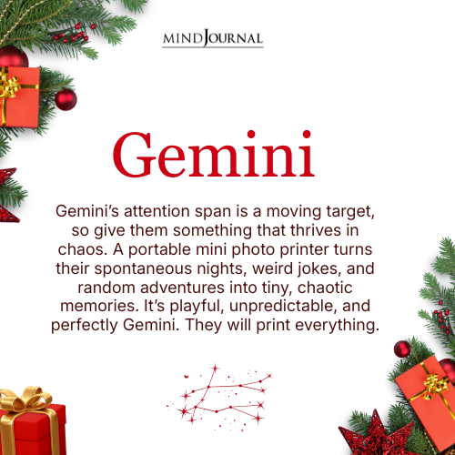 The perfect Christmas gift for Gemini is a portable mini photo printer – not branded, just the type that connects to their phone and prints tiny photos instantly.