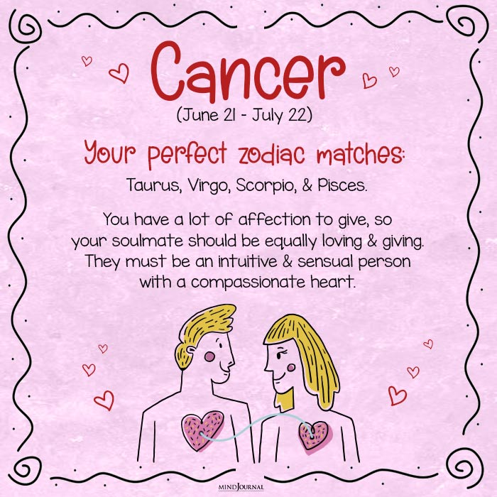 Perfect zodiac match for Cancer: Taurus, Virgo, Scorpio, and Pisces.
