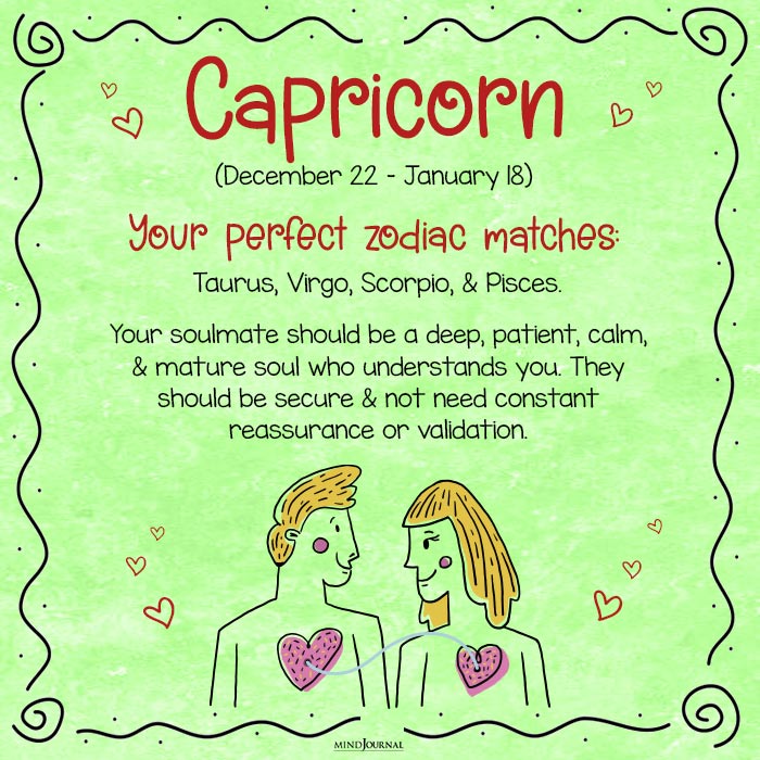 Perfect zodiac match for Capricorn: Taurus, Virgo, Scorpio, and Pisces.