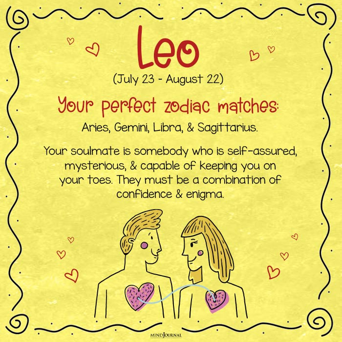 Perfect zodiac match for Leo: Aries, Gemini, Libra, and Sagittarius.