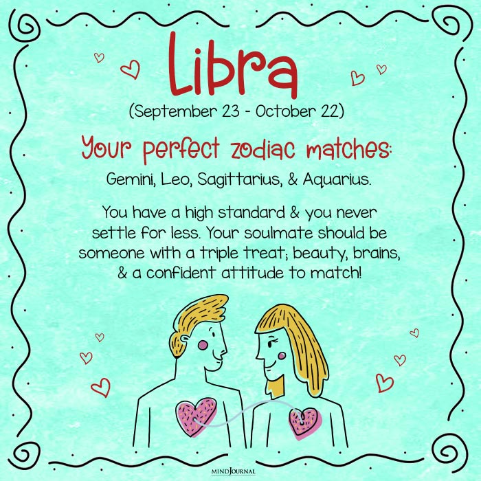 Perfect zodiac match for Libra: Gemini, Leo, Sagittarius, and Aquarius.