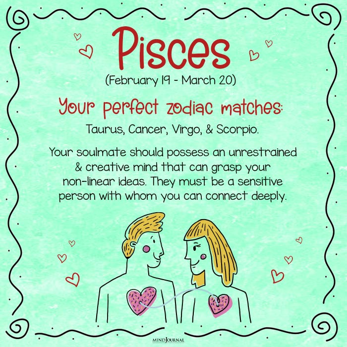 Pisces have their own dream world where they live most of the time and donโt take life very seriously. The perfect zodiac soulmate for Pisces is a person with a decent amount of self-confidence and an unrestrained, creative mind that can grasp non-linear ideas.