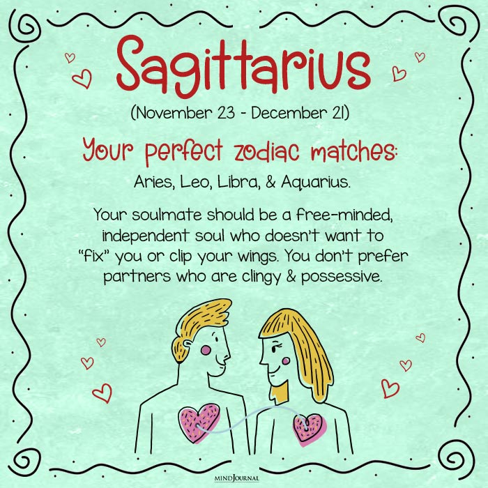 Freedom and independence are very dear to a Sagittarius. They donโt prefer partners who are clingy and act over-possessive. Their perfect zodiac soulmate is a light-hearted, fun-loving person with a liberal approach to life.