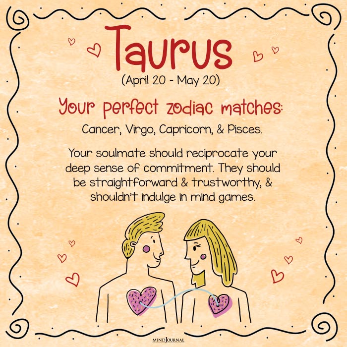 Perfect zodiac match for Taurus: Cancer, Virgo, Capricorn, and Pisces.