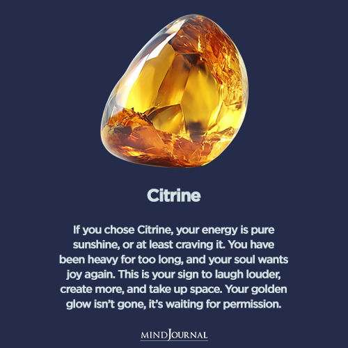 If you chose Citrine in this pick a crystal test, you are glowing with manifesting energy right now, even if you don’t realize it. Citrine represents happiness, creativity, and confidence. Your soul is craving fun, abundance, and that effortless “main character” energy.