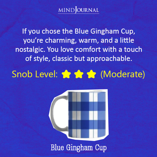 Did you pick the blue gingham cup? Choosing it reveals your love for familiarity, and tradition, with just enough style to keep it interesting.