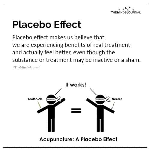 Placebo effect makes us believe that we are experiencing benefits of real treatment and actually feel better, even though the substance or treatment may be inactive or a sham.