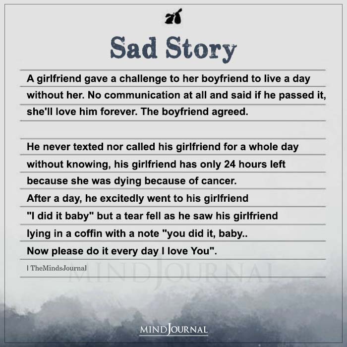 Sad story. A girlfriend gave a challenge to her boyfriend to live a day without her. No communication at all and said if he passed it, she’ll love him forever. The boyfriend agreed. He never texted nor called his girlfriend for a whole day without knowing, his girlfriend has only 24 hours left because she was dying because of cancer. After a day, he excitedly went to his girlfriend “I did it baby” but a tear fell as he saw his girlfriend lying in a coffin with a note “you did it, baby.. Now please do it every day I love You”.