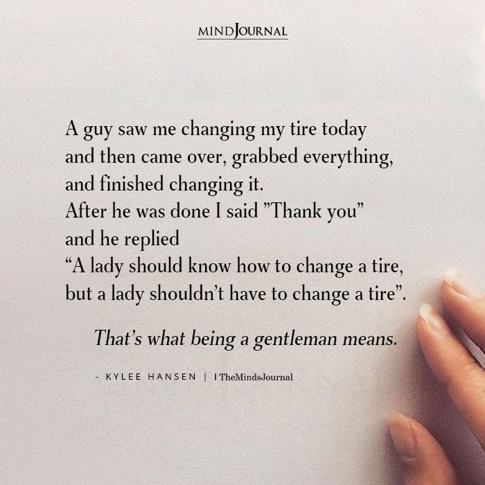 A guy saw me changing my tire today and then came over, grabbed everything, and finished changing it. After he was done I said “Thank you” and he replied “A lady should know how to change a tire, but a lady shouldn’t have to change a tire”. That’s what being a gentleman means.
