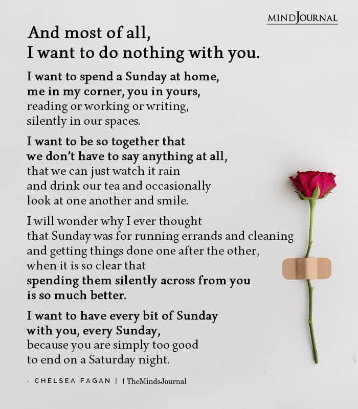 And most of all, I want to do nothing with you. I want to spend a Sunday at home, me in my corner, you in yours, reading or working or writing, silently in our spaces. I want to be so together that we don’t have to say anything at all, that we can just watch it rain and drink our tea and occasionally look at one another and smile. I will wonder why I ever thought that Sunday was for running errands and cleaning and getting things done one after the other, when it is so clear that spending them silently across from you is so much better. I want to have every bit of Sunday with you, every Sunday, because you are simply too good to end on a Saturday night.