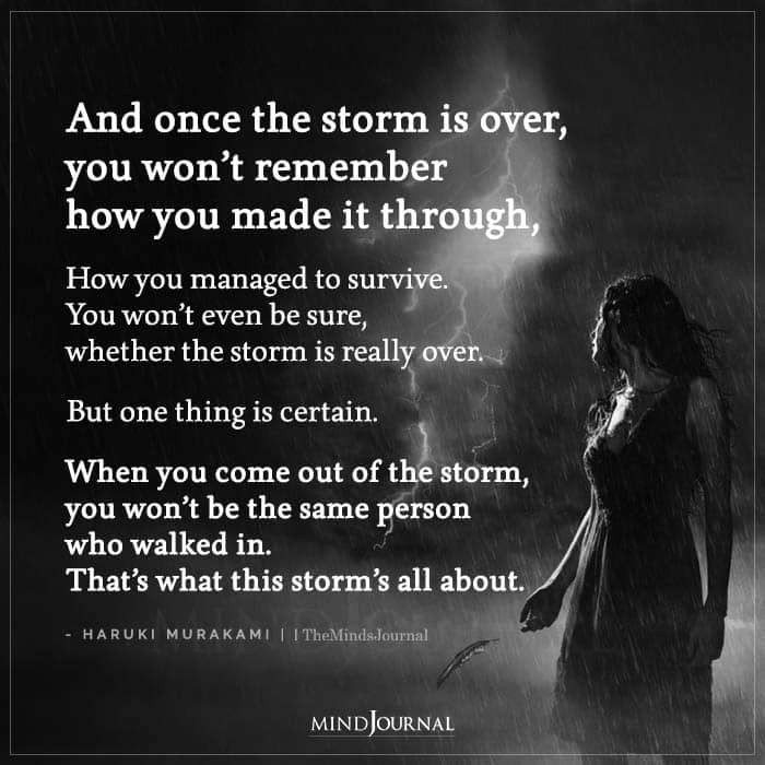 “And once the storm is over, you won’t remember how you made it through, how you managed to survive. You won’t even be sure, whether the storm is really over. But one thing is certain. When you come out of the storm, you won’t be the same person who walked in. That’s what this storm’s all about.”
