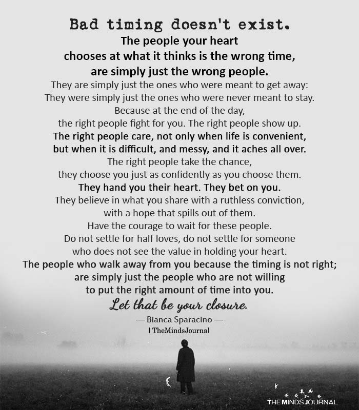Bad timing doesnโt exist. The people your heart chooses at what it thinks is the wrong time, are simply just the wrong people. They are simply just the ones who were meant to get away: They were simply just the ones who were never meant to stay. Because at the end of the day, the right people fight for you. The right people show up. The right people care, not only when life is convenient, but when it is difficult and messy, and it aches all over. The right people take the chance, they choose you just as confidently as you choose them. They hand you their heart. They bet on you. They believe in what you share with a ruthless conviction, with a hope that spills out of them. Have the courage to wait for these people. Do not settle for half loves, do not settle for someone who does not see the value in holding your heart. The people who walk away from you because the timing is not right; are simply just the people who are not willing to put the right amount of time into you. Let that be your closure.