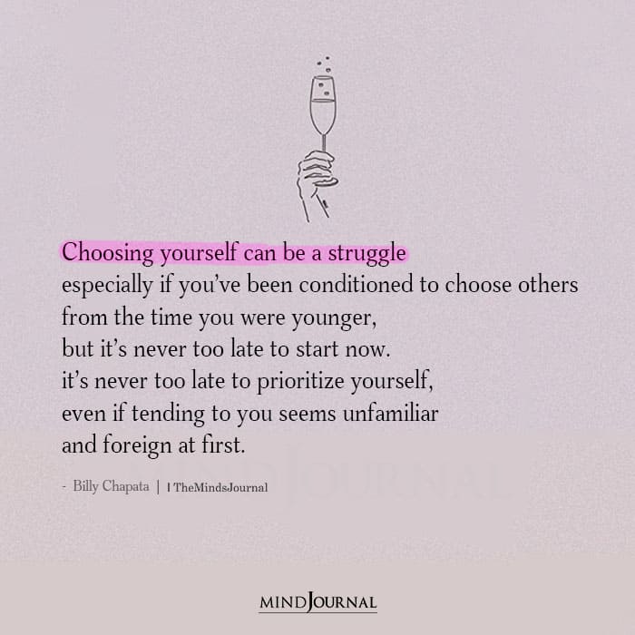 “Choosing yourself can be a struggle especially if you’ve been conditioned to choose others from the time you were younger, but it’s never too late to start now. it’s never too late to prioritize yourself, even if tending to you seems unfamiliar and foreign at first.”