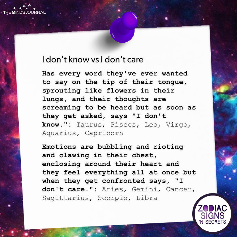 Emotions are bubbling and rioting and clawing in their chest, enclosing around their heart and they feel everything all at once but when they get confronted says, “I don’t care.”: Aries, Gemini, Cancer, Sagittarius, Scorpio, Libra