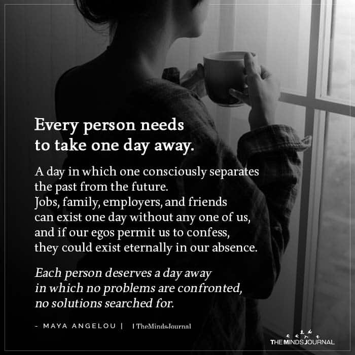 This quote by Maya Angelou, “Every person needs to take one day away. A day in which one consciously separates the past from the future. Jobs, family, employers, and friends can exist one day without any one of us, and if our egos permit us to confess, they could exist eternally in our absence.