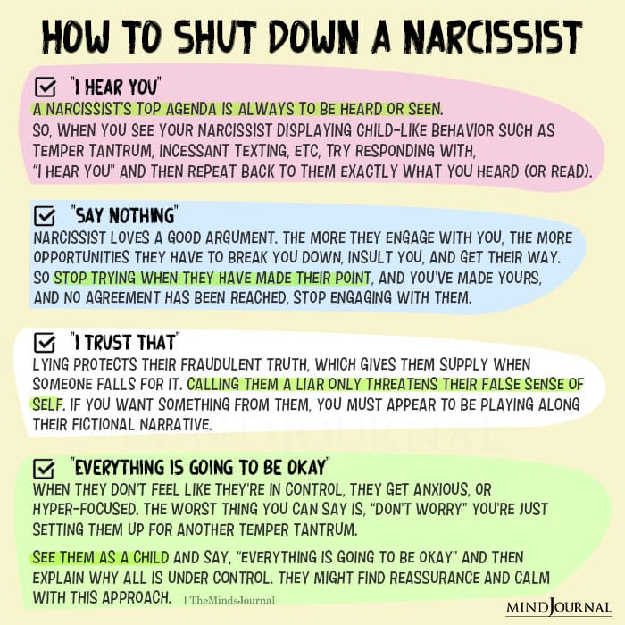 Narcissist loves a good argument. The more they engage with you, the more opportunities they have to break you down, insult you, and get their way. So stop trying when they have made their point, and you’ve made yours, and no agreement has been reached, stop engaging with them.“I Trust That”