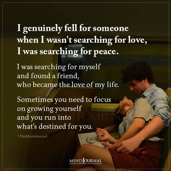 I genuinely fell for someone when I wasn’t searching for love, I was searching for peace. I was searching for myself and found a friend, who became the love of my life. Sometimes you need to focus on growing yourself and you run into what’s destined for you.