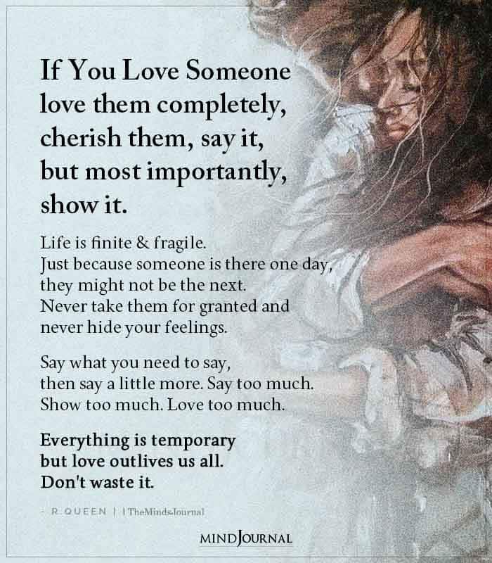 If You Love Someone love them completely, cherish them, say it, but most importantly, show it. Life is finite & fragile. Just because someone is there one day, they might not be the next. Never take them for granted and never hide your feelings. Say what you need to say, then say a little more. Say too much. Show too much. Love too much. Everything is temporary but love outlives us all. Don’t waste it.