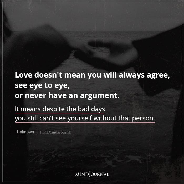 Love doesn’t mean you will always agree, see eye to eye, or never have an argument. It means despite the bad days you still can’t see yourself without that person.