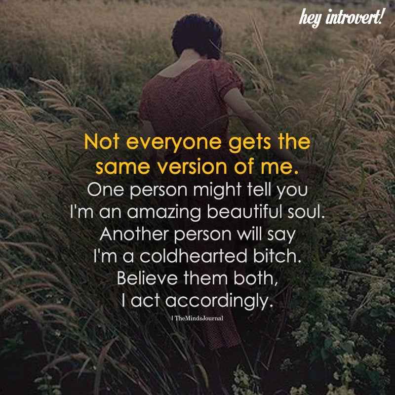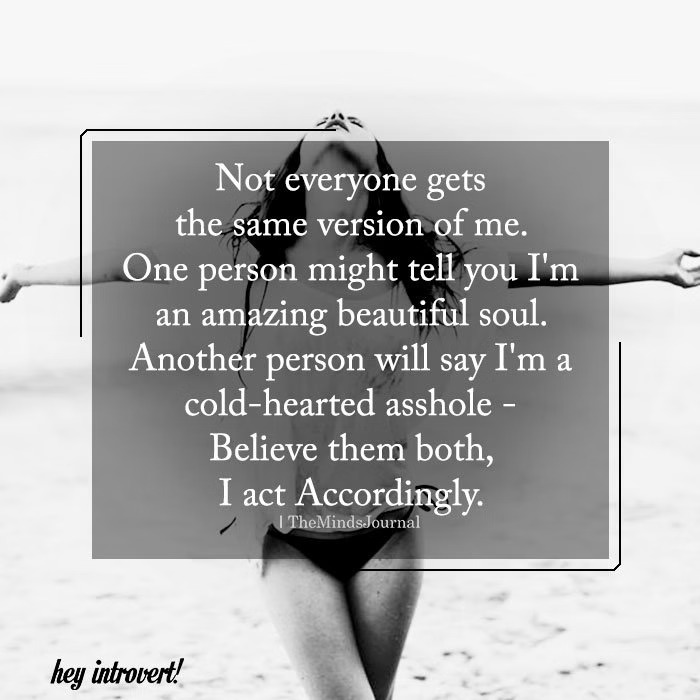 Not everyone gets the same version of me. One person might tell you Iโm an amazing beautiful soul. Another person will say Iโm a cold-hearted asshole โ Believe them both, I act Accordingly.