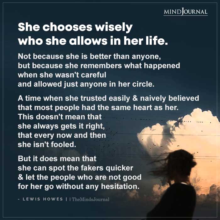 She chooses wisely who she allows in her life. Not because she is better than anyone, but because she remembers what happened when she wasn’t careful and allowed just anyone in her circle.
