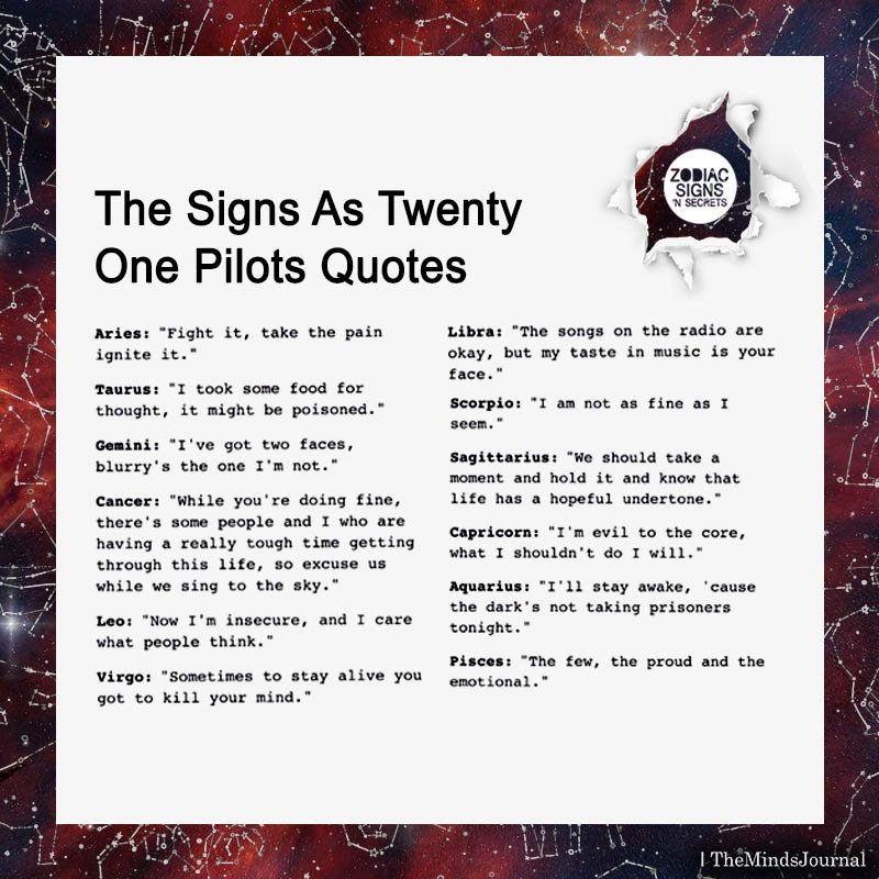 Aquarius: “I’ll stay awake, ’cause the dark’s not taking prisoners tonight. and The proud and the emotional.”