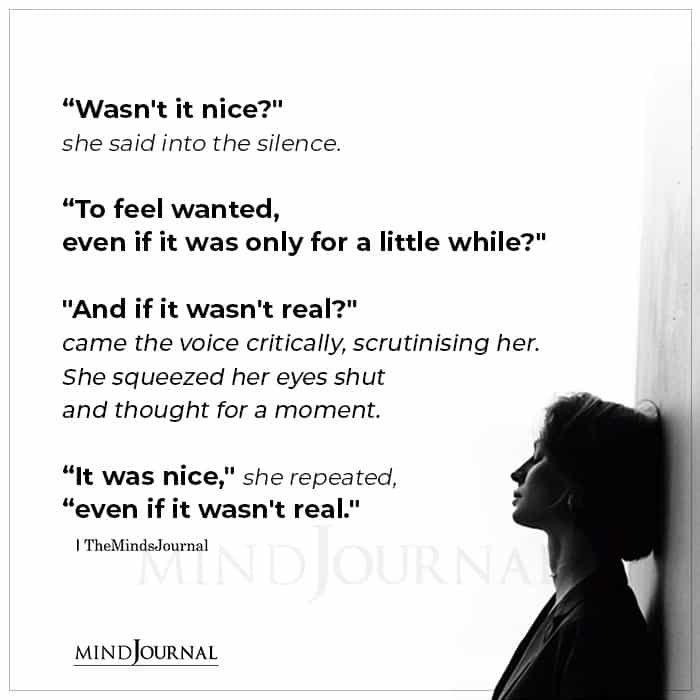 Wasn’t it nice?” she said into the silence. “To feel wanted, even if it was only for a little while?” “And if it wasn’t real?” came the voice critically, scrutinising her. She squeezed her eyes shut and thought for a moment. “It was nice,” she repeated, “even if it wasn’t real.”