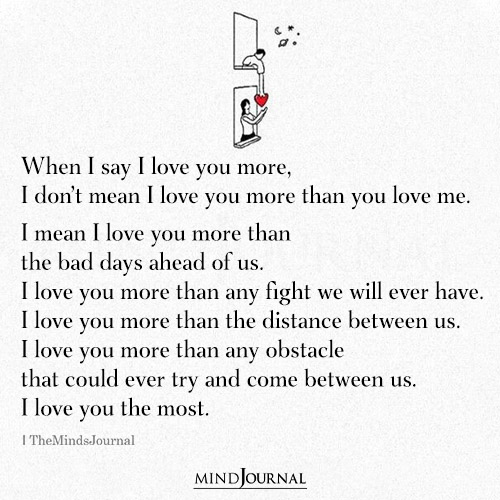 When I say I love you more, I don’t mean I love you more than you love me. I mean I love you more than the bad days ahead of us. I love you more than any fight we will ever have. I love you more than the distance between us. I love you more than any obstacle that could ever try and come between us. I love you the most.