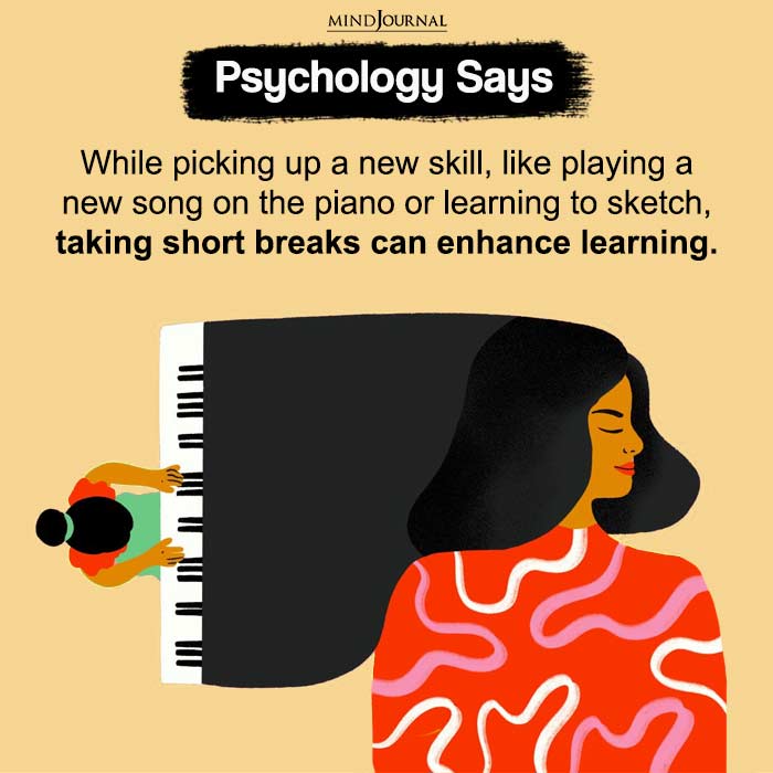 While picking up a new skill, like playing a new song on the piano or learning to sketch, taking short breaks can enhance learning.