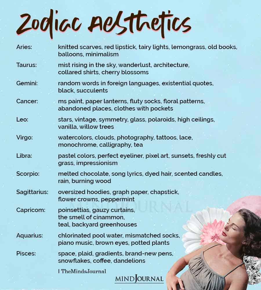Libra: pastel colors, perfect eyeliner, pixel art, sunsets, freshly cut grass, impressionism