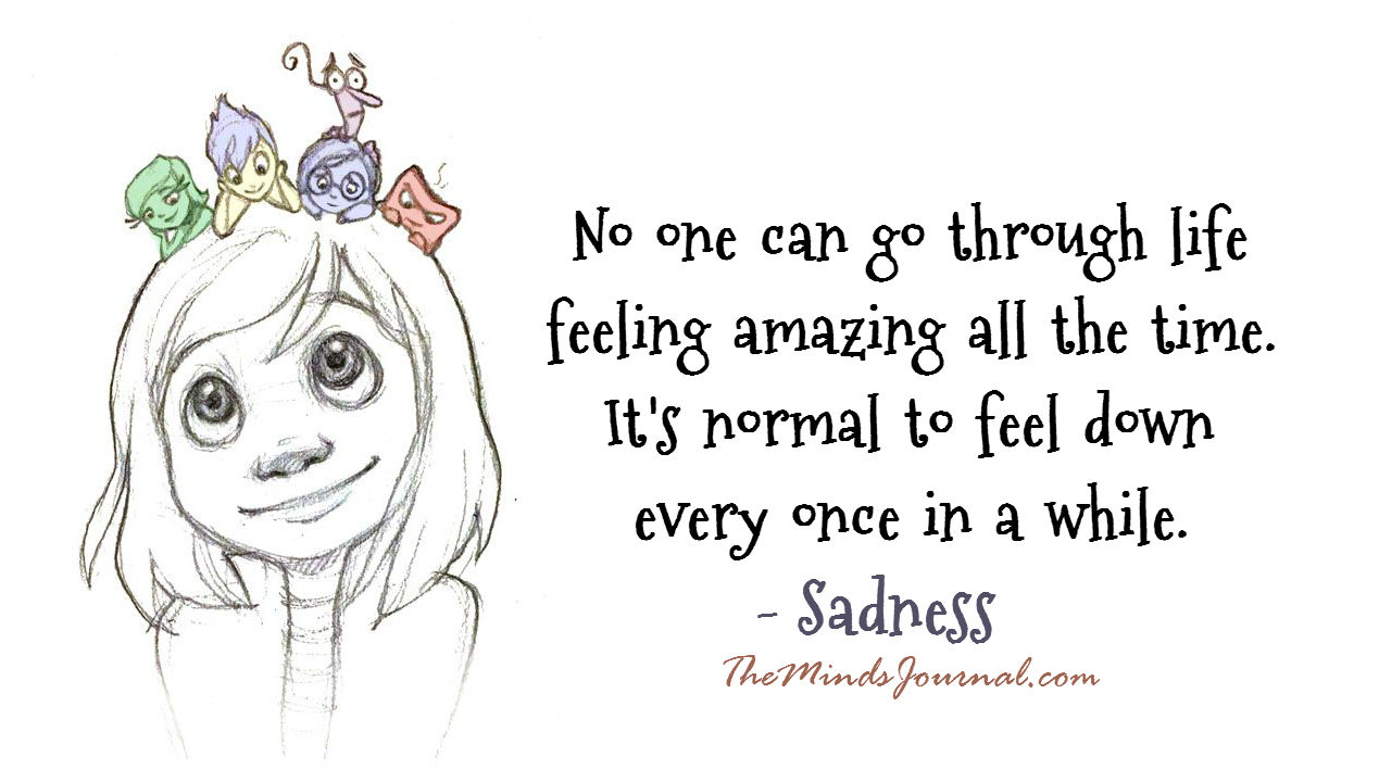 All in all, ‘Inside Out’ is an imaginative triumph of an artistic depiction of psychology as it applies to emotion or should we say five emotions: fear, disgust, anger, sadness and joy. In the film, these five emotions essentially control the every day life of the main character, named Riley. In the beginning (mirroring the beliefs of our current American society), it is clear that sadness seems to serve no positive purpose. In fact, sadness is downright unwanted and thus resisted by happiness. Again, I was gearing myself up to be disappointed by the message of the film. But without spoiling the entire plot line of the film, I will say that I was more than pleasantly surprised when the moral of the story cast sadness in an entirely different light. In fact, the film conveyed that sadness was essential to the integrity of Riley’s personality structure. Numbness was in fact the ‘villain’ of the tale. Which spells one thing for me so loudly that I was nearly skipping back to the car in the parking lot after the film finished… SOCIETY IS WAKING UP AND HUMAN CONSCIOUSNESS IS EVOLVING. The overall message of the film was to embrace emotion, even the ones that don’t feel positive.