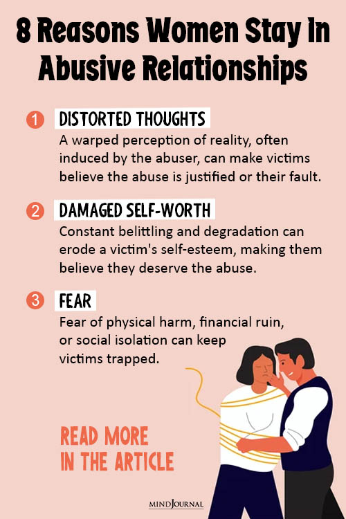Although these eight reasons for staying are common, they do not describe every victim and situation. Women can also be perpetrators, any gender can be a victim, and there are many patterns of violence.