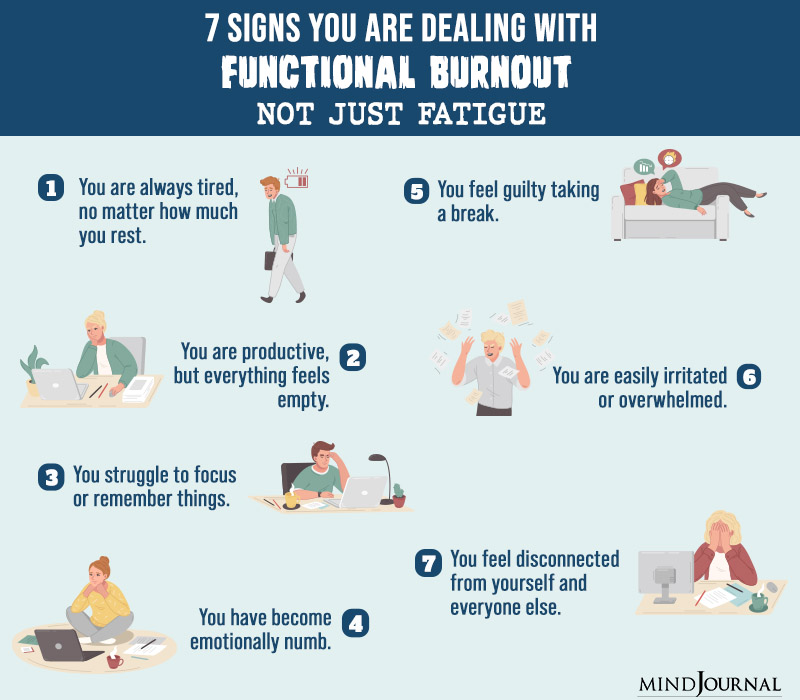 Functional burnout is when you are completely drained and exhausted, but still managing to “function.” You are socializing, working, and fulfilling all your responsibilities, but all of it feels mechanical and as if you are just going through the motions.