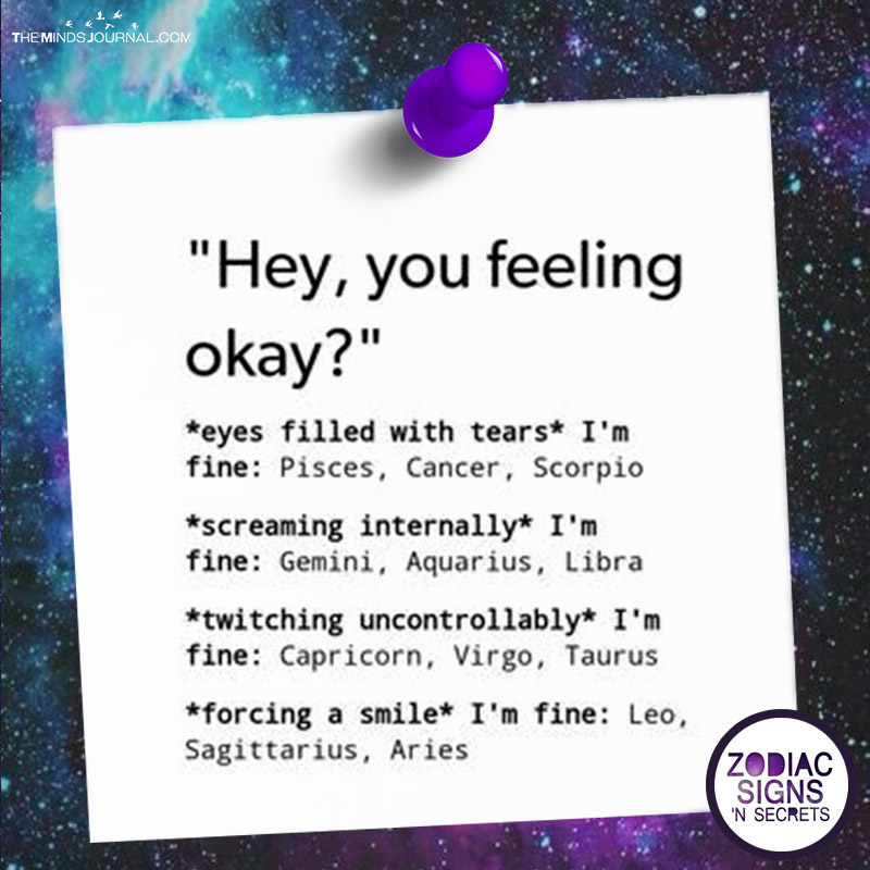 *forcing a smile* I’m fine: Leo, Sagittarius, Aries