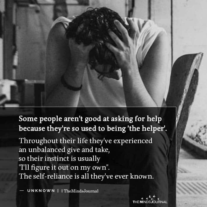 Some people aren’t good at asking for help because they’re so used to being ‘the helper’. Throughout their life they’ve experienced an unbalanced give and take, so their instinct is usually “I’ll figure it out on my own”. The self-reliance is all they’ve ever known.