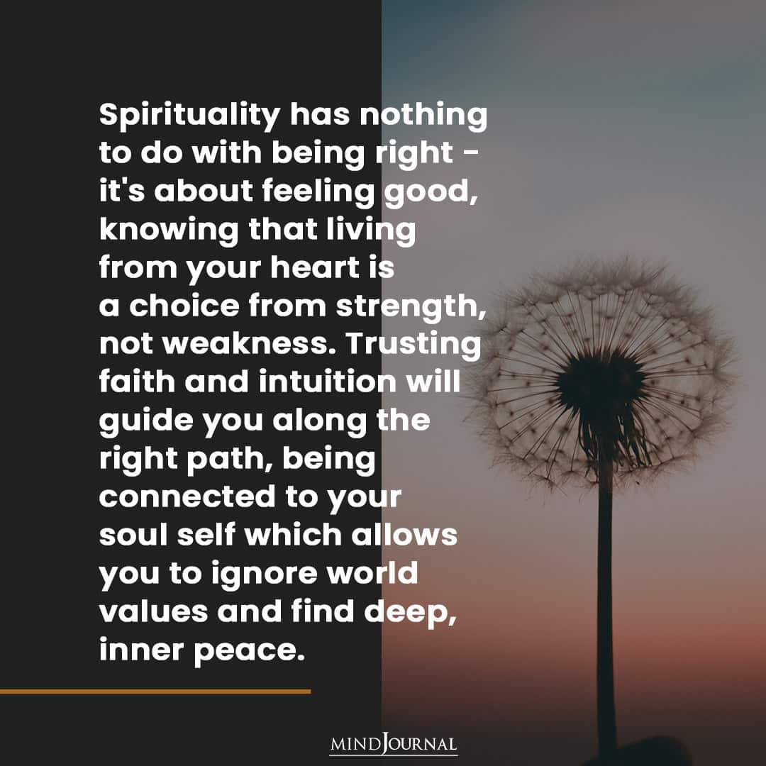 Spirituality has nothing to do with being right – it’s about feeling good, knowing that living from your heart is a choice from strength, not weakness. Trusting faith and intuition will guide you along the right path, being connected to your soul self which allows you to ignore world values and find deep, inner peace.