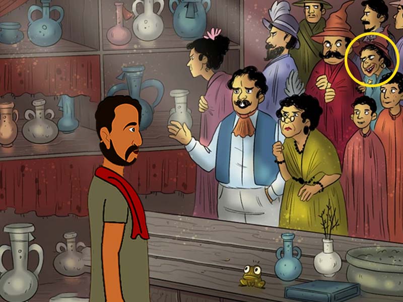 So, where is the elusive witch hiding? If you examine the reactions and expressions of the people inside the shop, you’ll uncover her. Focus your attention on the lady in the right-most corner; she’s the Halloween witch! A wand hides within her robe, and it’s pretty clear it’s not up for sale in the store.