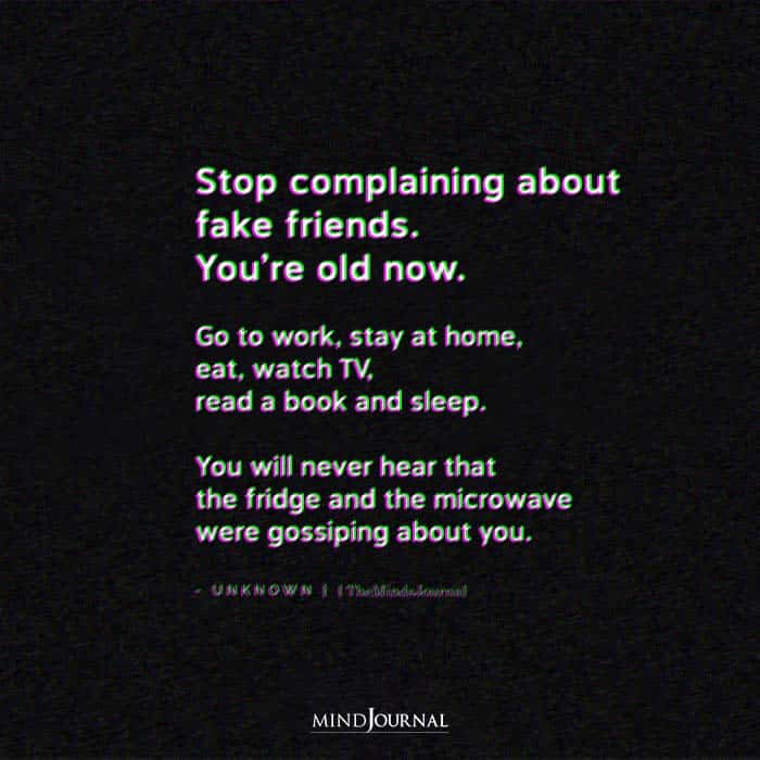 Stop complaining about fake friends. You’re old now. Go to work, stay at home, eat, watch TV, read a book and sleep. You will never hear that the fridge and the microwave were gossiping about you.