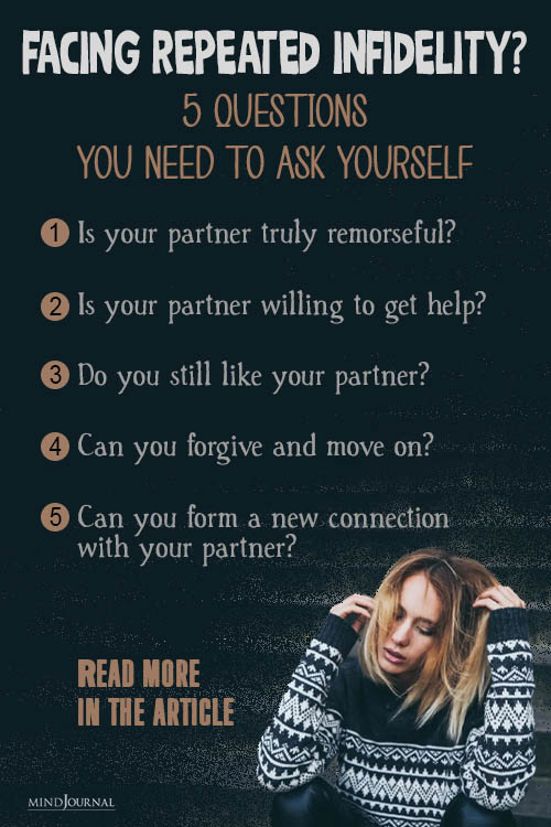 Is your partner taking responsibility for their actions? Are they willing to get help to identify why they repeatedly cheat? Do you still like your partner? Can you forgive and move on? Do you see a path to a new relationship? All of these things are important to take into account when figuring out what your next steps are.