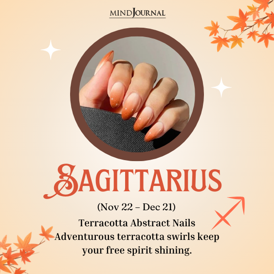 Sagittarius is adventurous and free-spirited, which makes terracotta abstract nails your best fit. Rustic orange-browns paired with playful swirls or geometric designs bring out your bold, adventurous side. These nails look like a fall landscape painted right onto your fingertips.