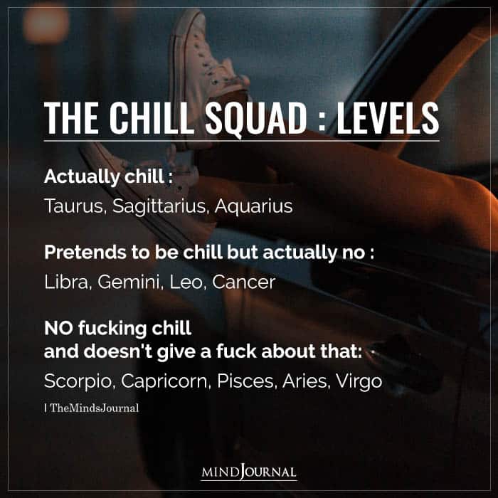 NO fucking chill and doesn’t give a fuck about that: Scorpio, Capricorn, Pisces, Aries, Virgo
